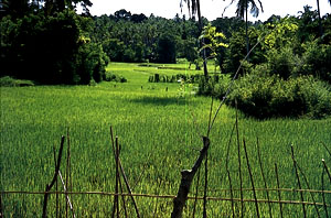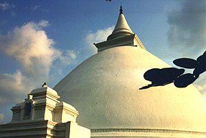 The traditional Sri Lankan dagoba (from which the word "pagoda" is derived) is a bell-shaped mound of earth and bricks surmounted by a square platfrom above which rises a tapering spire topped by a gilded spiky ornament. The whole structure is plastered white and is usually surrounded by a walled courtyard containing statues of Buddha, flower altars and possibly a Bo (peepul) tree. |